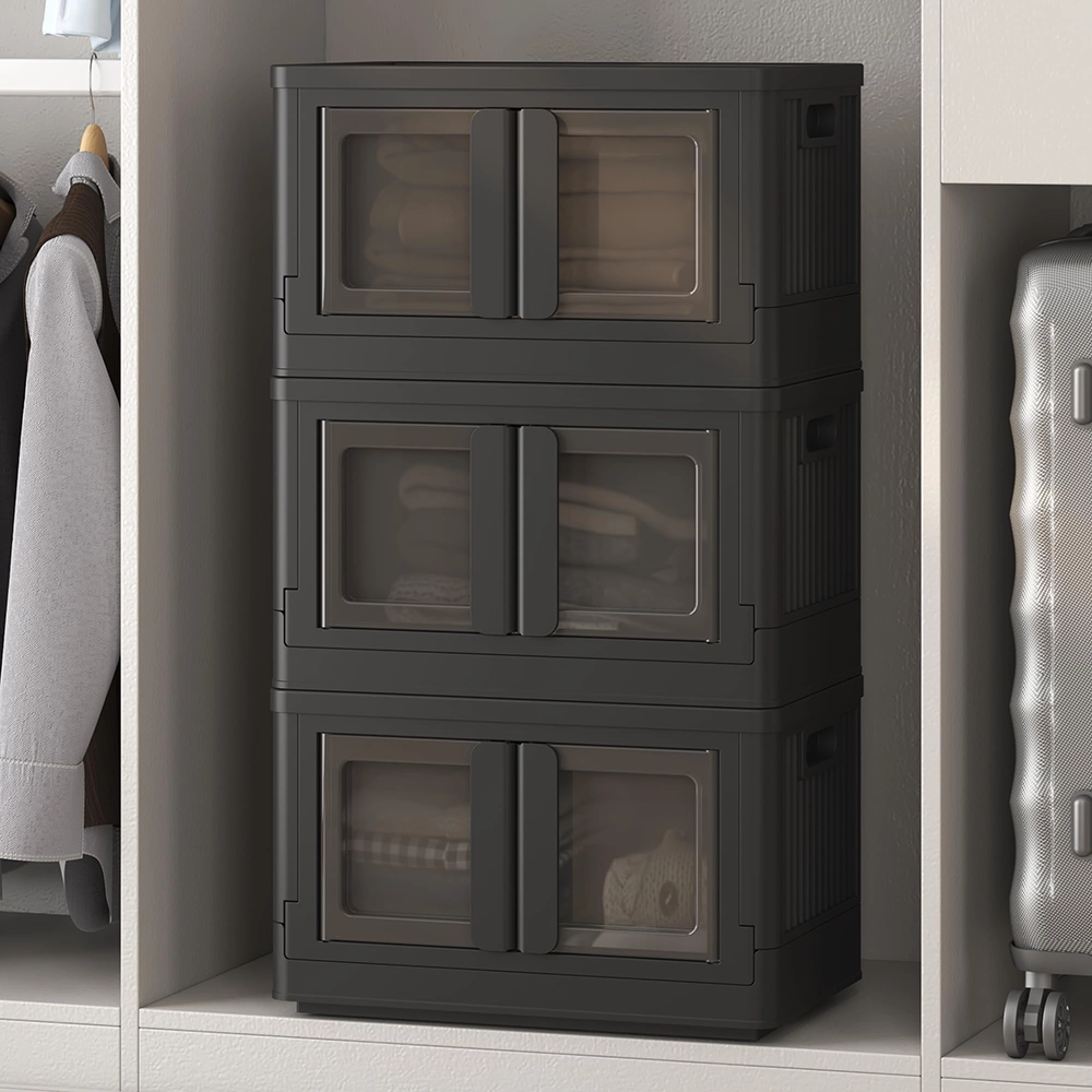 Durable 110 QT stackable, collapsible storage bins with lids, doors, and built-in wheels for easy organization at home, dorm, or closet.