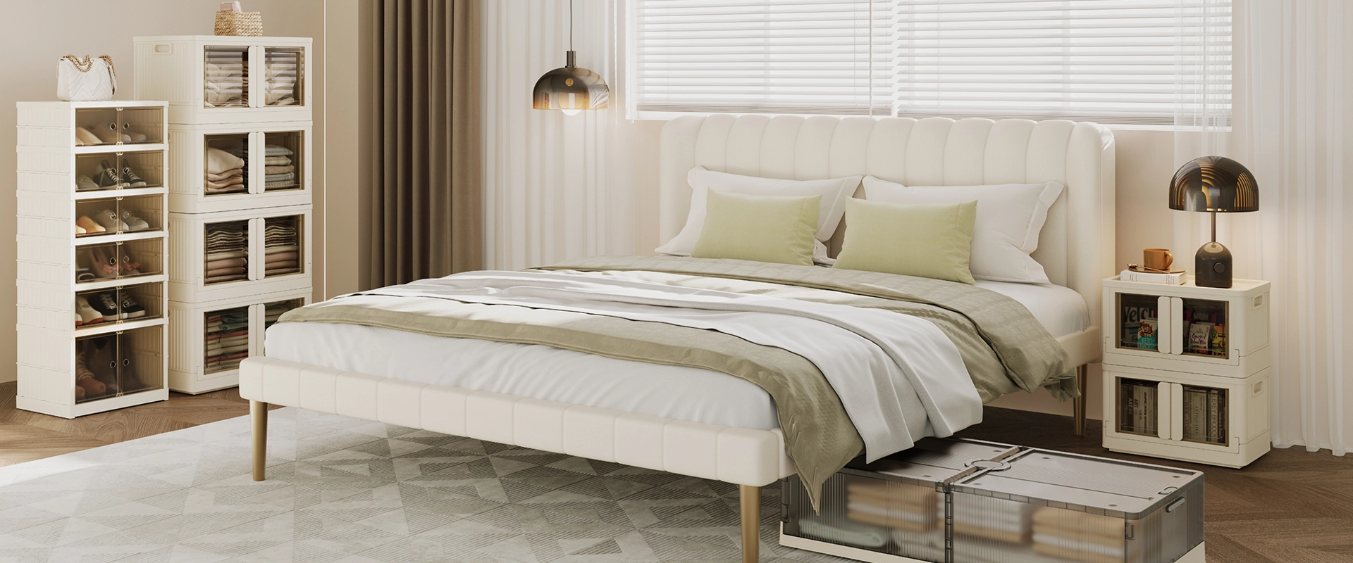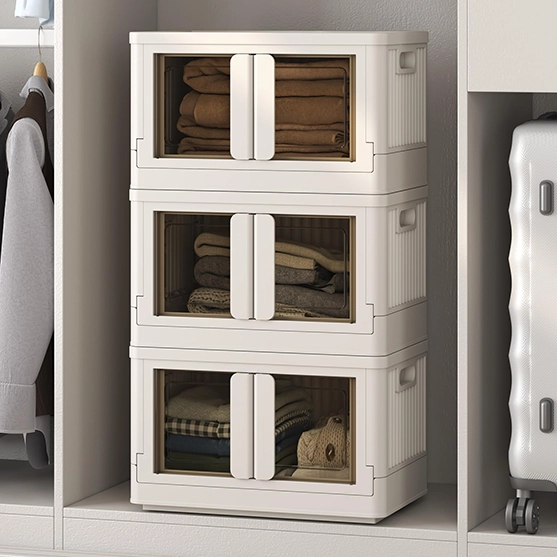 75 QT stackable, collapsible storage bins with lids, built-in wheels, and doors, perfect for home organization and easy mobility.