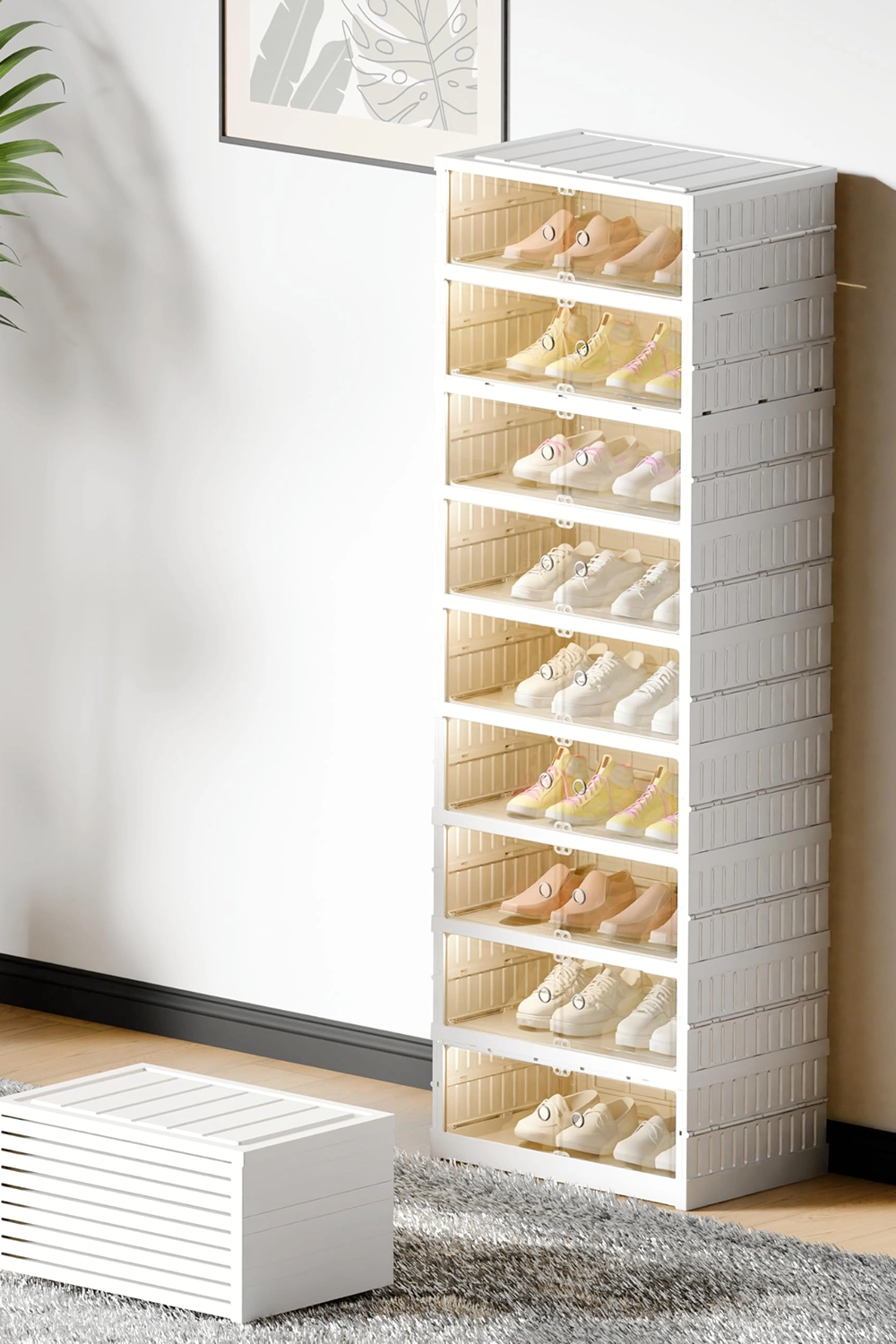 9-tier portable and collapsible shoe rack with magnetic clear door, perfect for organizing up to 18 pairs in closets or entryways.