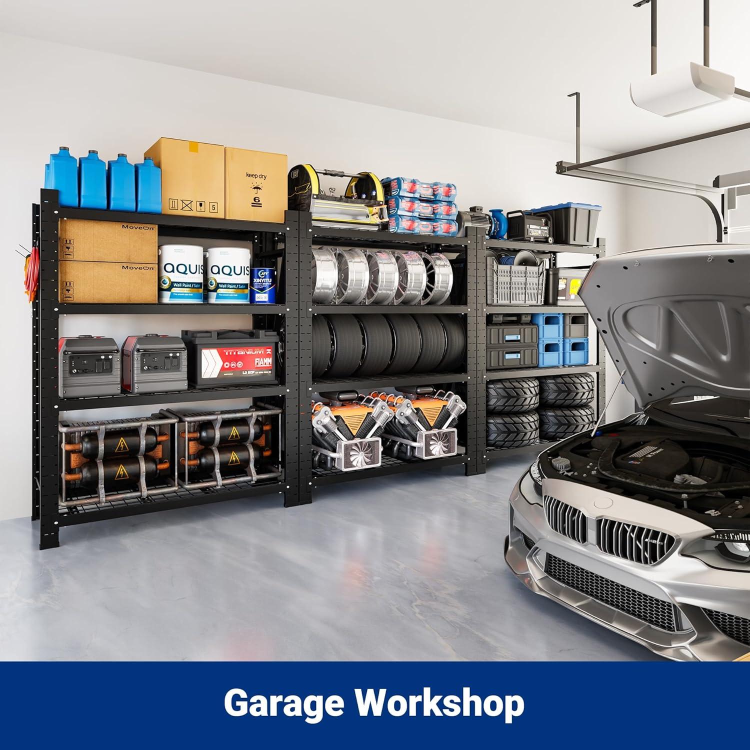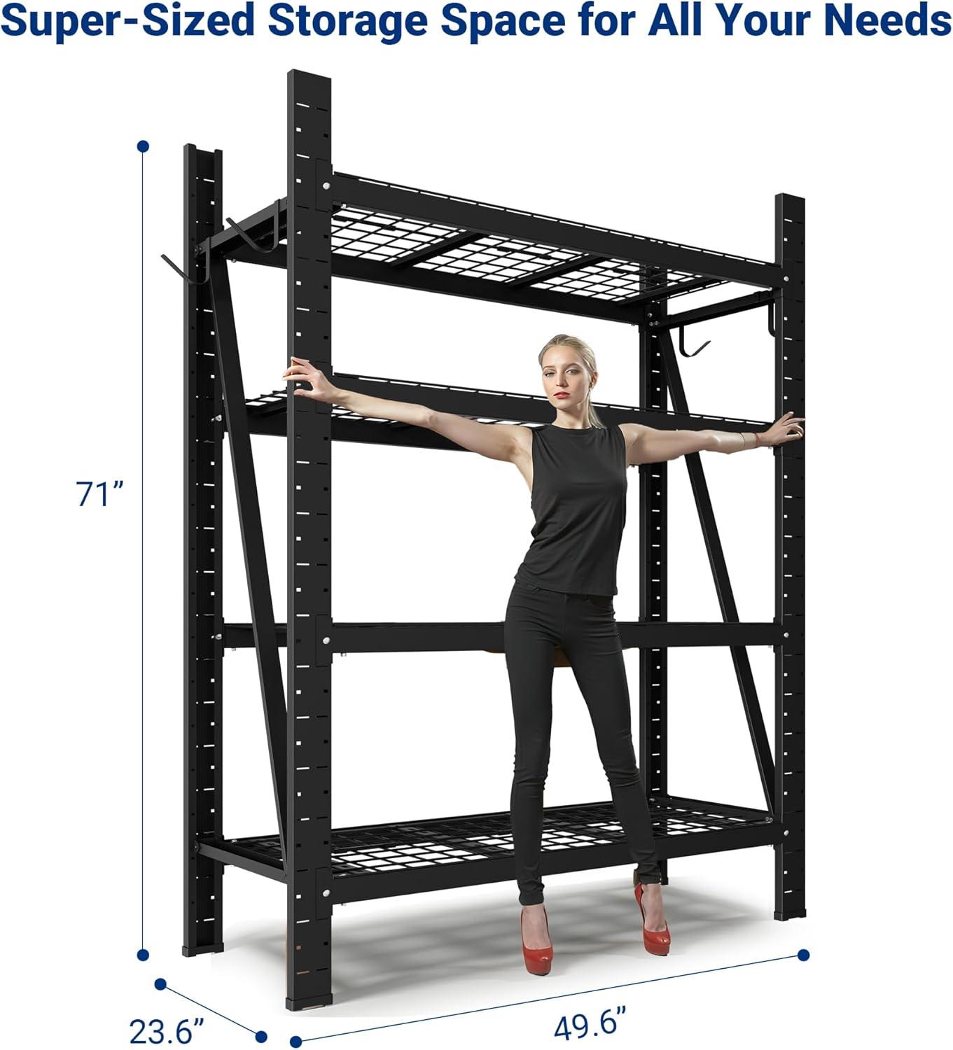 Spacious Storage for Oversized Items – With its 23.6″D x 49.6″W x 71″H design, this garage shelving unit easily handles everything from toolboxes and storage totes to sports gear and seasonal equipment. Ideal for garages, basements, warehouses, or workshops, these versatile storage shelves create a clean, organized space you can rely on