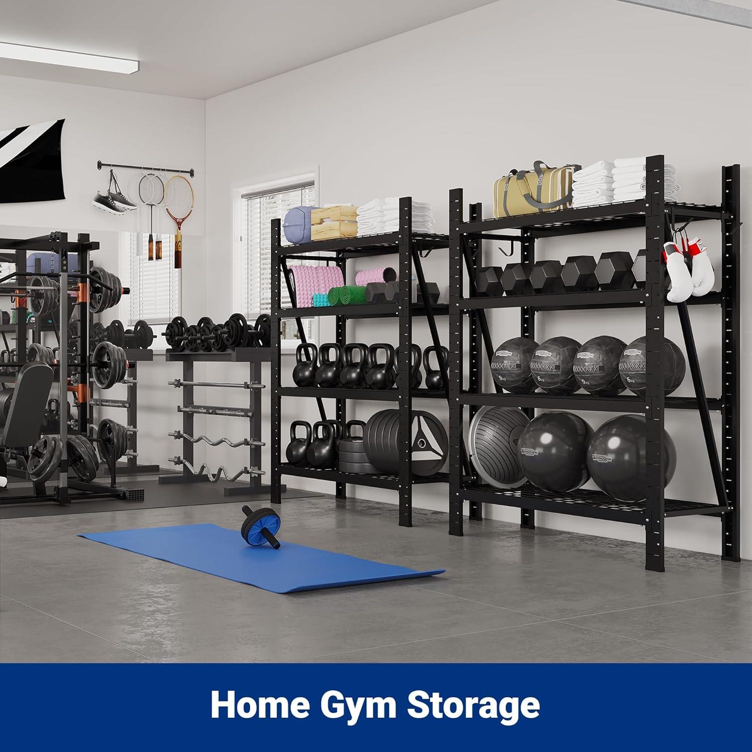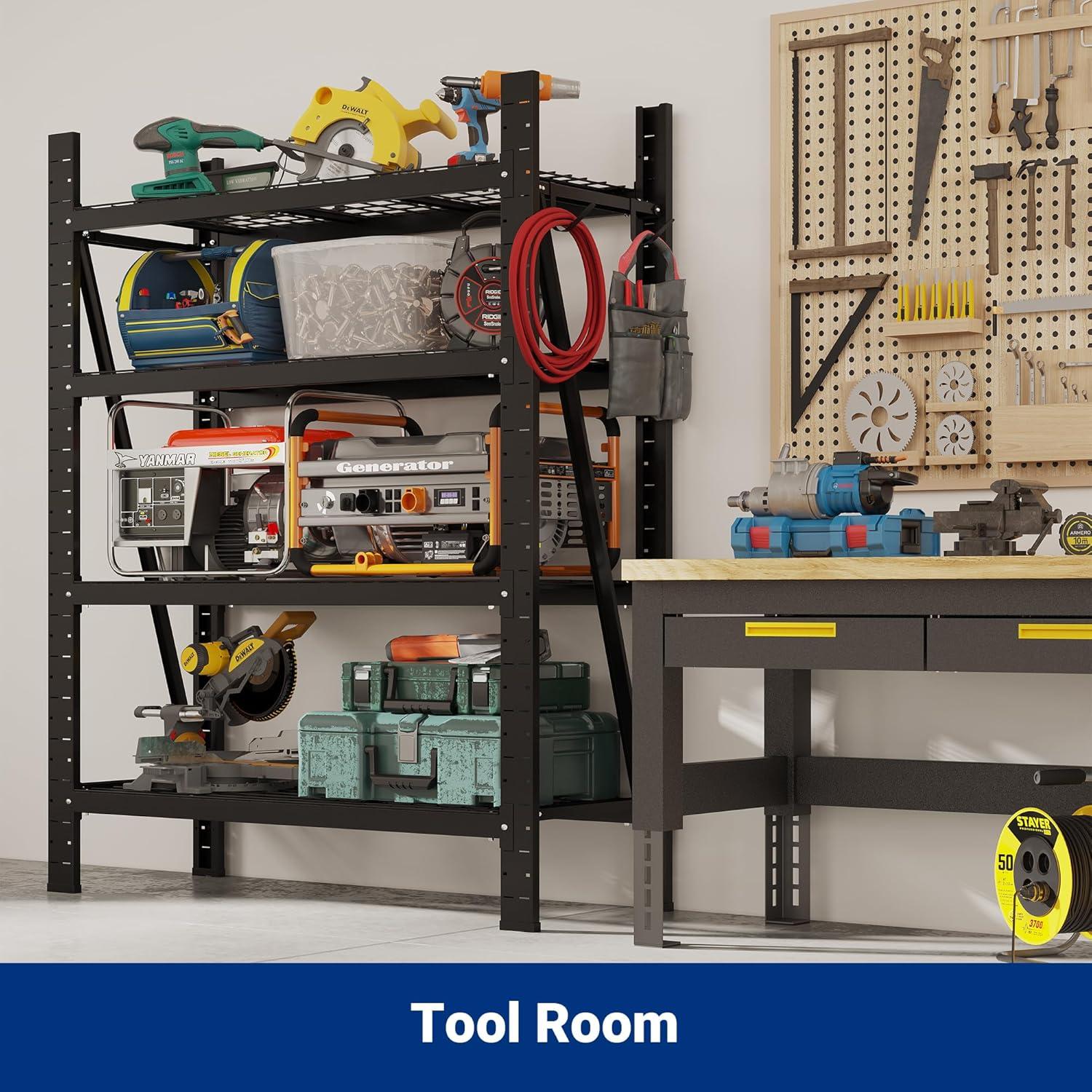 10000 lbs Load Capacity – The maximum capacity is up to 10000 lbs in total, with each shelf rated for 2500 lbs. The reinforced all-metal frame provides unmatched strength, easily supporting heavy tools, storage totes, and large equipment. For added convenience, this garage shelving unit also comes with 4 sturdy steel hooks (10 lbs each) to keep cords and small tools neatly organized
