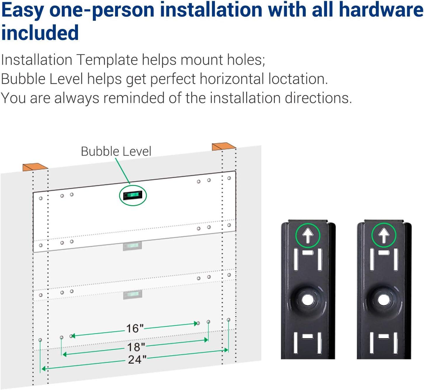 Easy to Assemble: Easy one-person installation with all hardware included: Installation Template helps mount holes; Bubble Level helps get perfect horizontal loctation; You are always reminded of the installation directions.