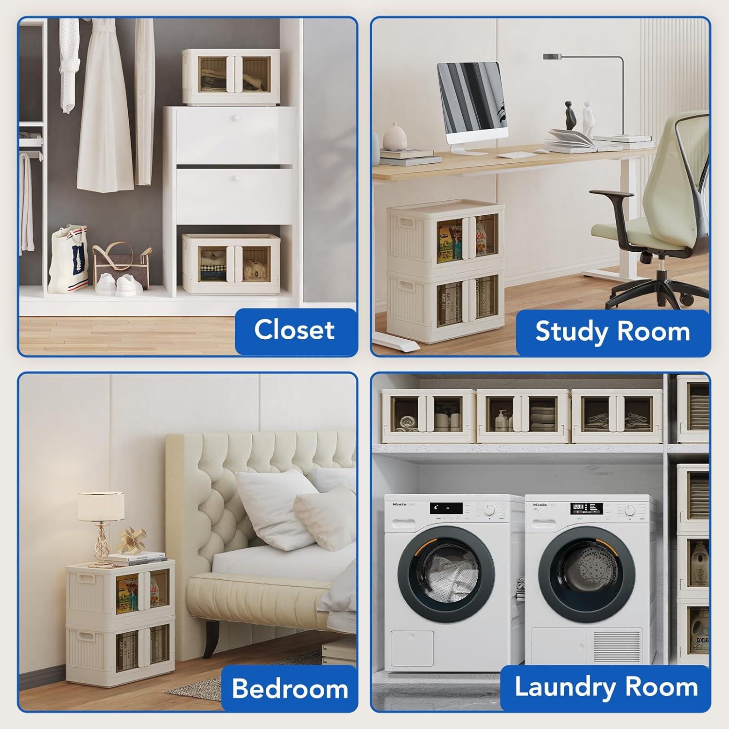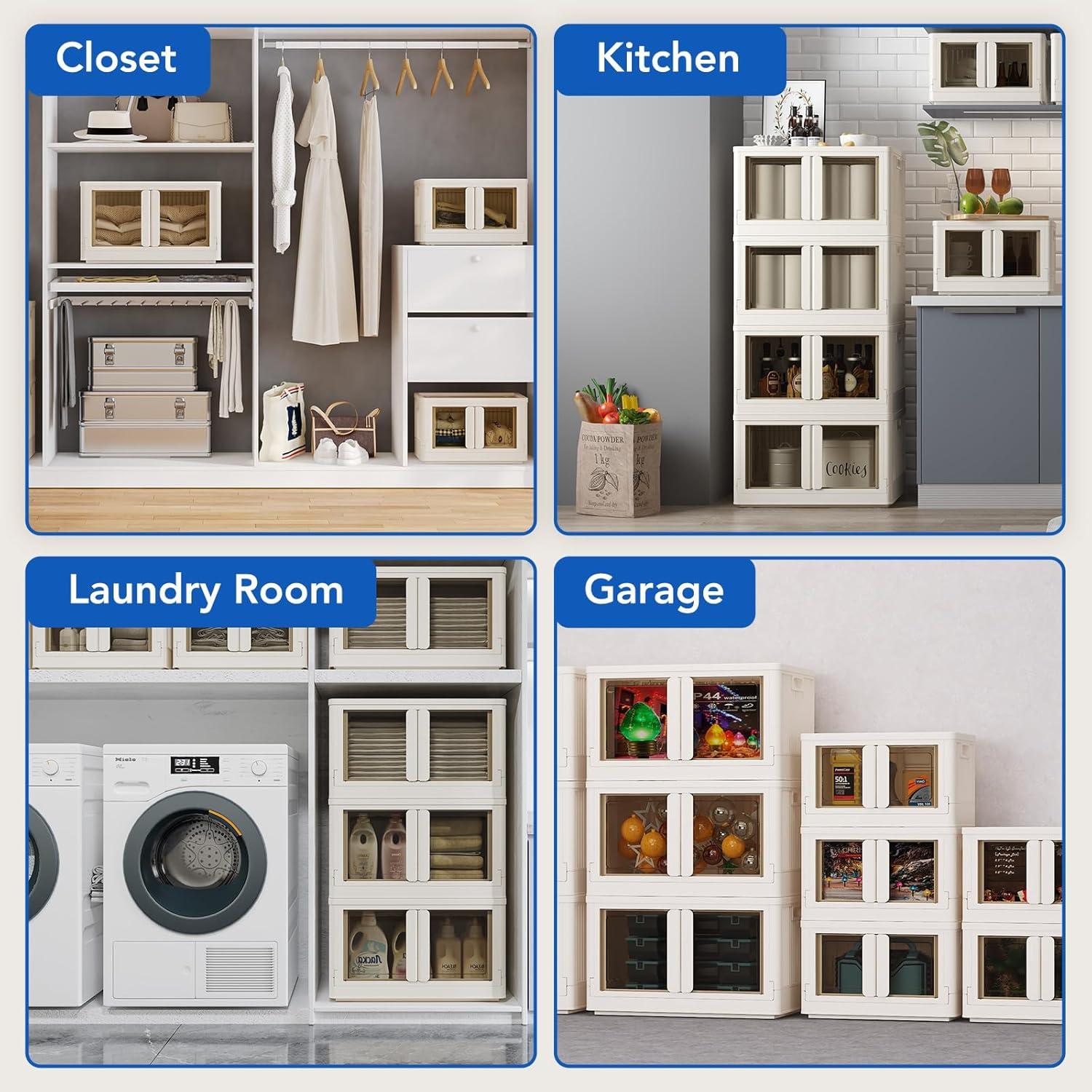 Instant Foldable Storage Bins With 4 Lids: Each storage bin can be used independently. These 304 QT collapsible storage bins with lids require no tools for installation and can be ready for use in as little as 10 seconds. When not needed, they can be easily folded and stored under the bed or couch or in any corner, taking up very little space.
