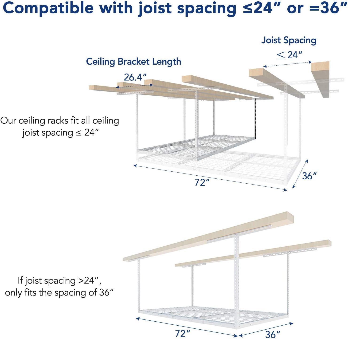 Various Installation Methods: This overhead storage rack fits all ceiling joist spacing ≤ 24″, if joist spacing > 24″, only fits the ceiling spacing of 48″. Also it's compatible with ceiling angles under 15 degrees. Suitable for wood studs/joists and concrete wall, CAN NOT be mounted to metal wall.