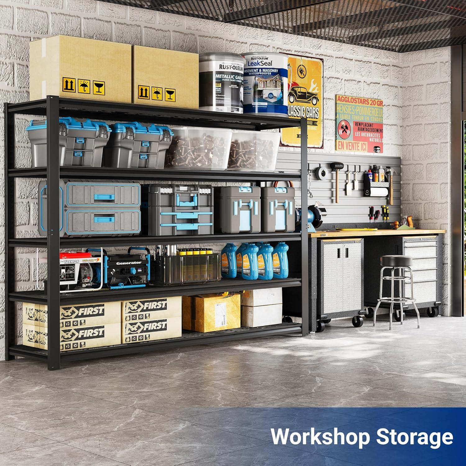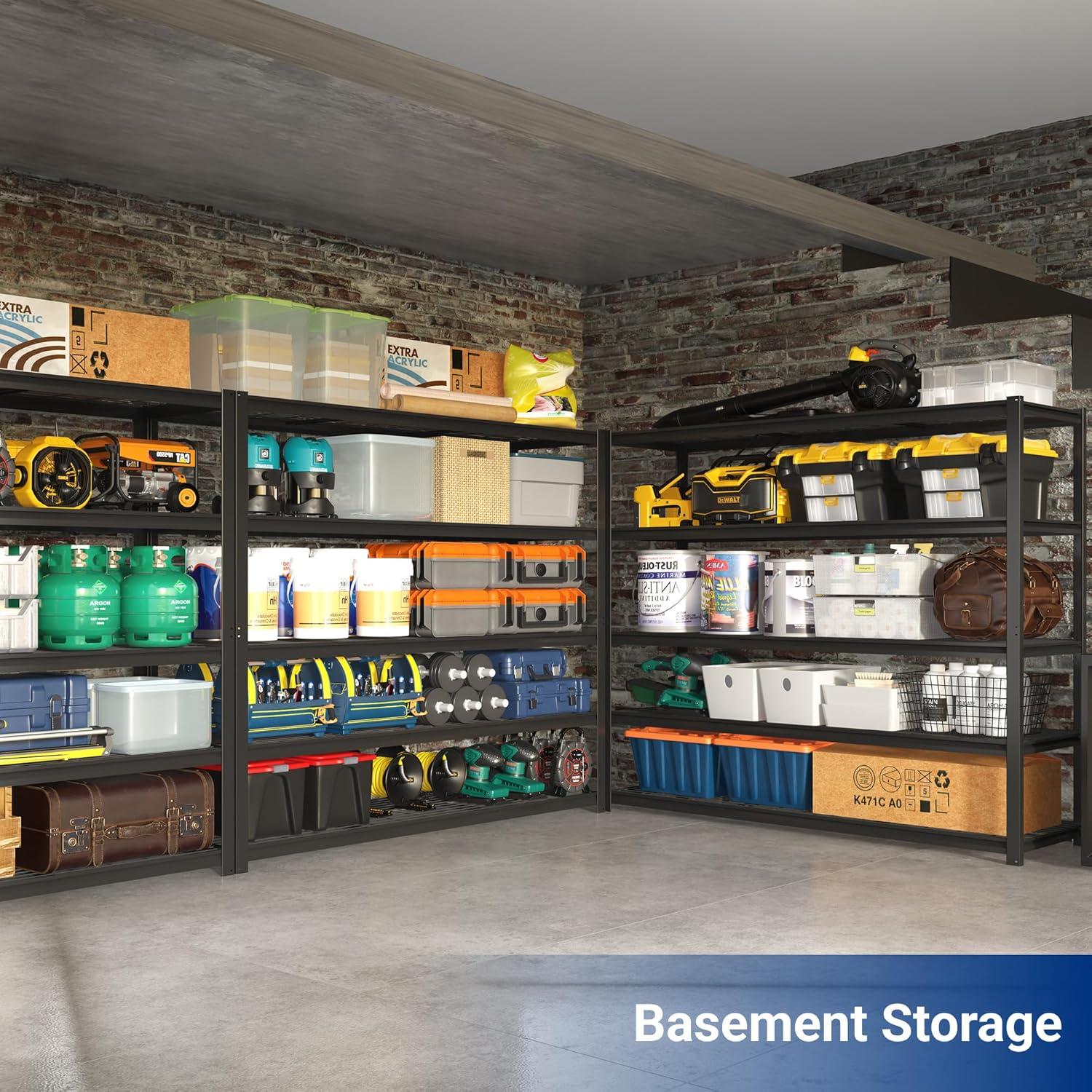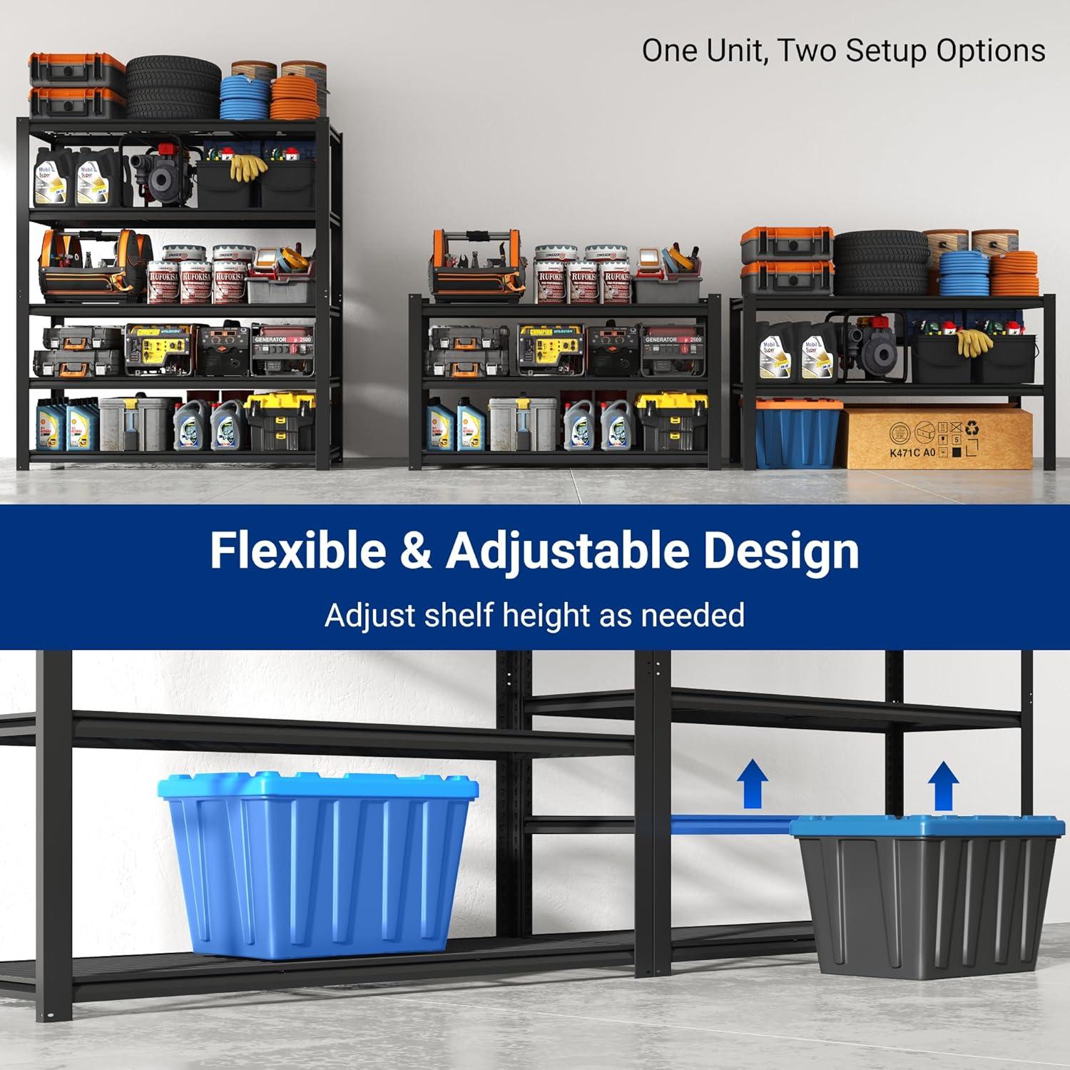 Adjustable & Split Design for Flexible Storage: The height of the storage shelves can be easily adjusted to fit items of all sizes—from large power tools to small accessories. The 5-tier garage storage shelves can also be split into two fully independent freestanding units (a 3-tier and a 2-tier rack), perfect for low-ceiling areas, under-stair spaces, closets, or any height-restricted spot in your garage or basement
