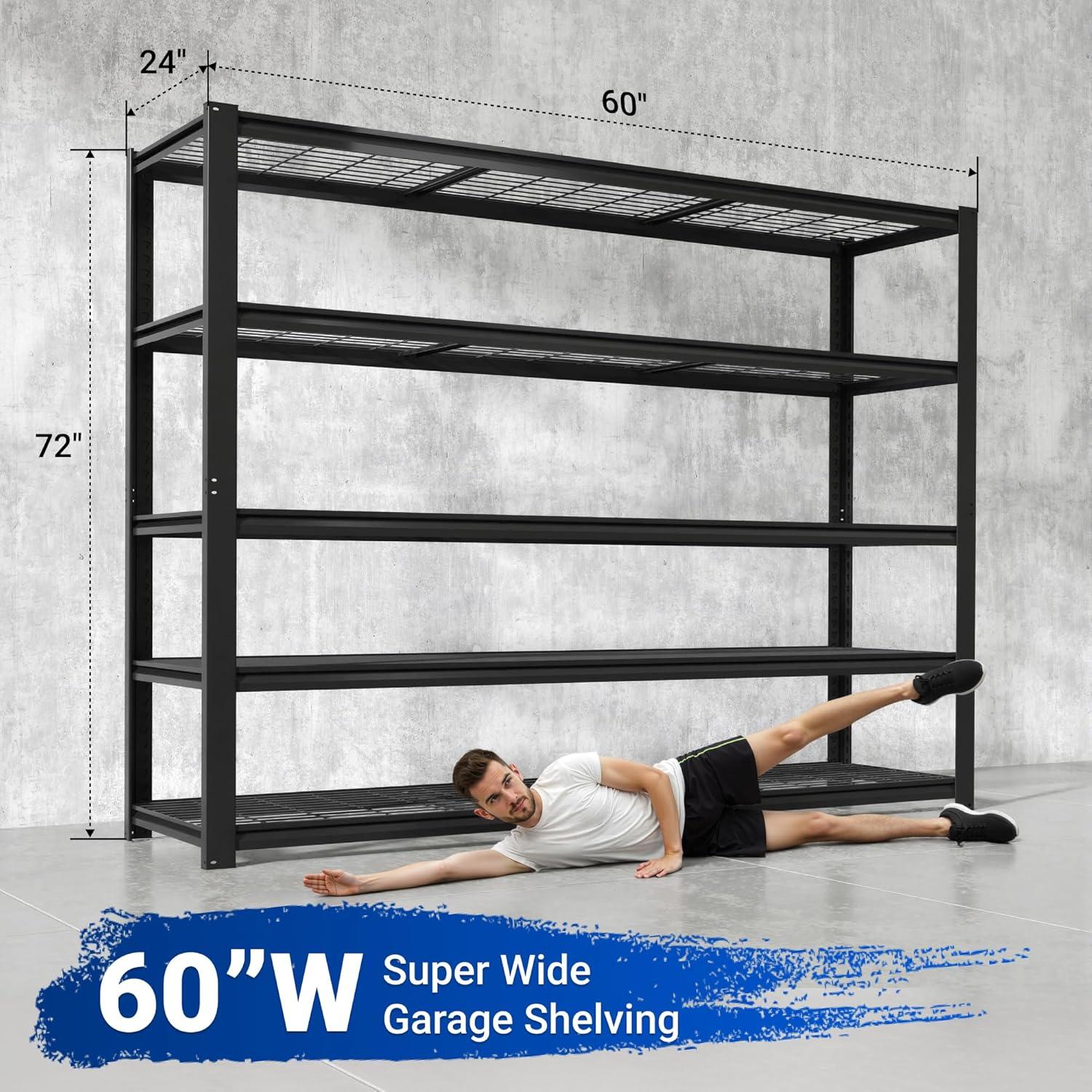 60″ Wide Heavy-Duty Garage Shelving: The extra-wide 60-inch design easily holds large power tools, bins, and bulkier equipment, giving you more room to organize items side by side. Ideal for your garage, basement, or workshop, and available in sleek black or bold red for a clean, modern look that keeps your space neat and efficient