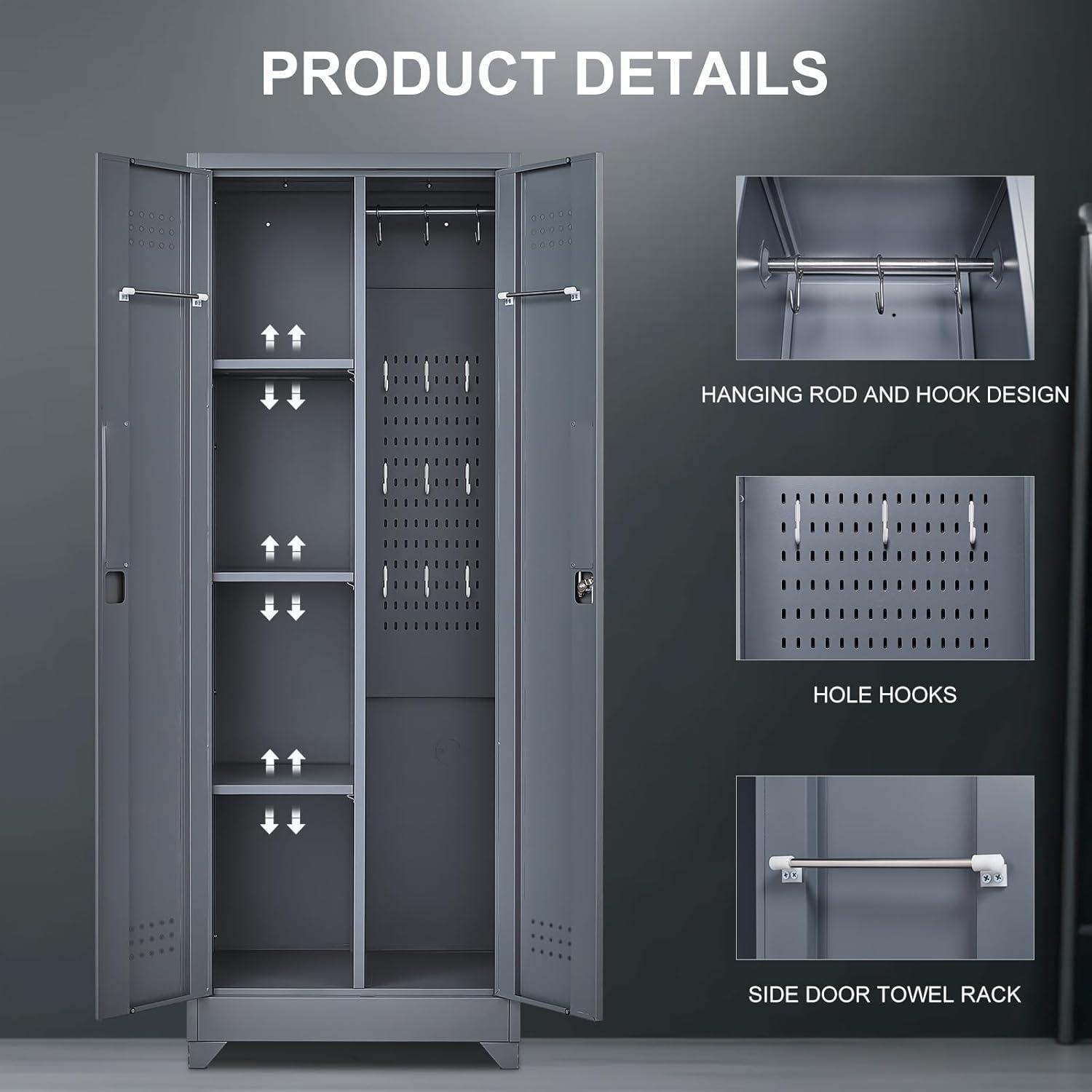 Versatile Storage Options: Equipped with hanging rods and shelves, this garage cabinet provides ample space to hang tools, or towels. Ideal for use as a garage storage cleaning tool or an office cabinet, it seamlessly integrates into basement storage systems, enhancing your organization.