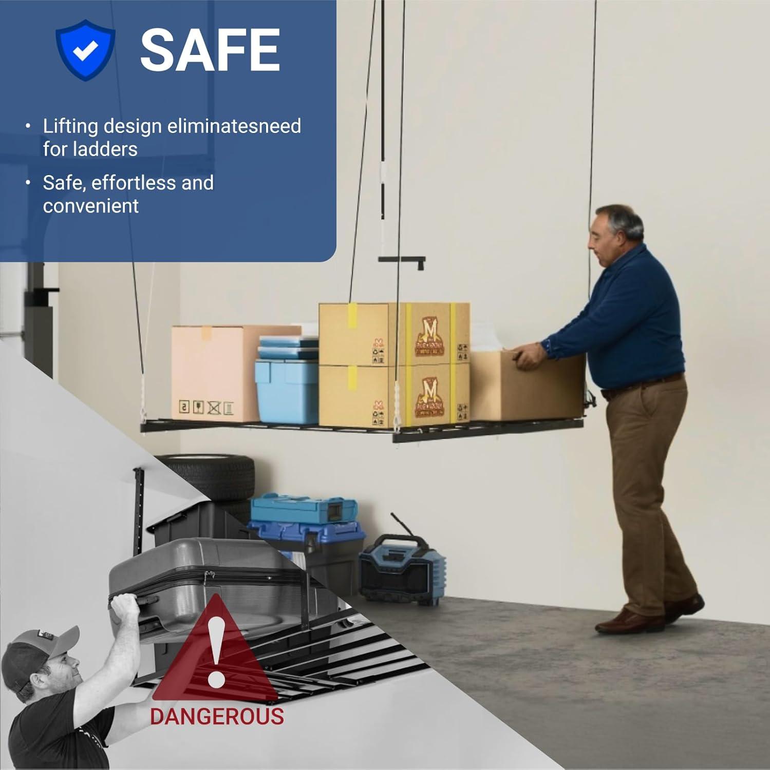 Maximize Garage Space: The 4×4 feet platform provides the perfect garage storage solution, protecting your belongings while utilizing ceiling space to store seasonal items and unused belongings.